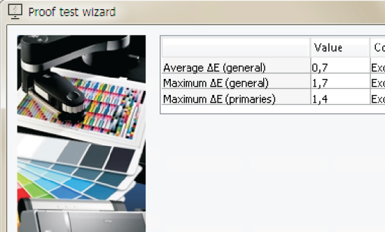 Proof Check – Proofers can be checked for color accuracy using the Proof test wizard tool, which tests the output for colour accuracy, gives average ∆E readings, and will pass or fail for color accuracy.